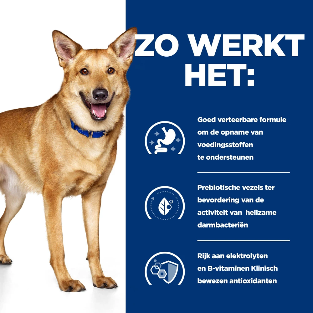 Hill’s Prescription Diet i/d Hondenvoer (Stoofpotje) is heerlijke voeding waarvan klinisch is bewezen dat deze spijsverteringsproblemen helpt verminderen. Dit goed verteerbaar voer is verrijkt met elektolyten en B-vitaminem om een gemakkelijke opname van voedingsstoffen te garanderen en verloren voedingsstoffen te vervangen. Versterkt met omega 3- en omega 6-vetzuren en klinisch bewezen antioxidanten om een gezond afweersysteem te helpen ondersteunen. Hill’s Prescription Diet i/d Hondenvoer is speciaal samengesteld om spijsverteringsproblemen te helpen verminderen en voldoet aan de speciale voedingsbehoeften van pups en volwassen honden.
