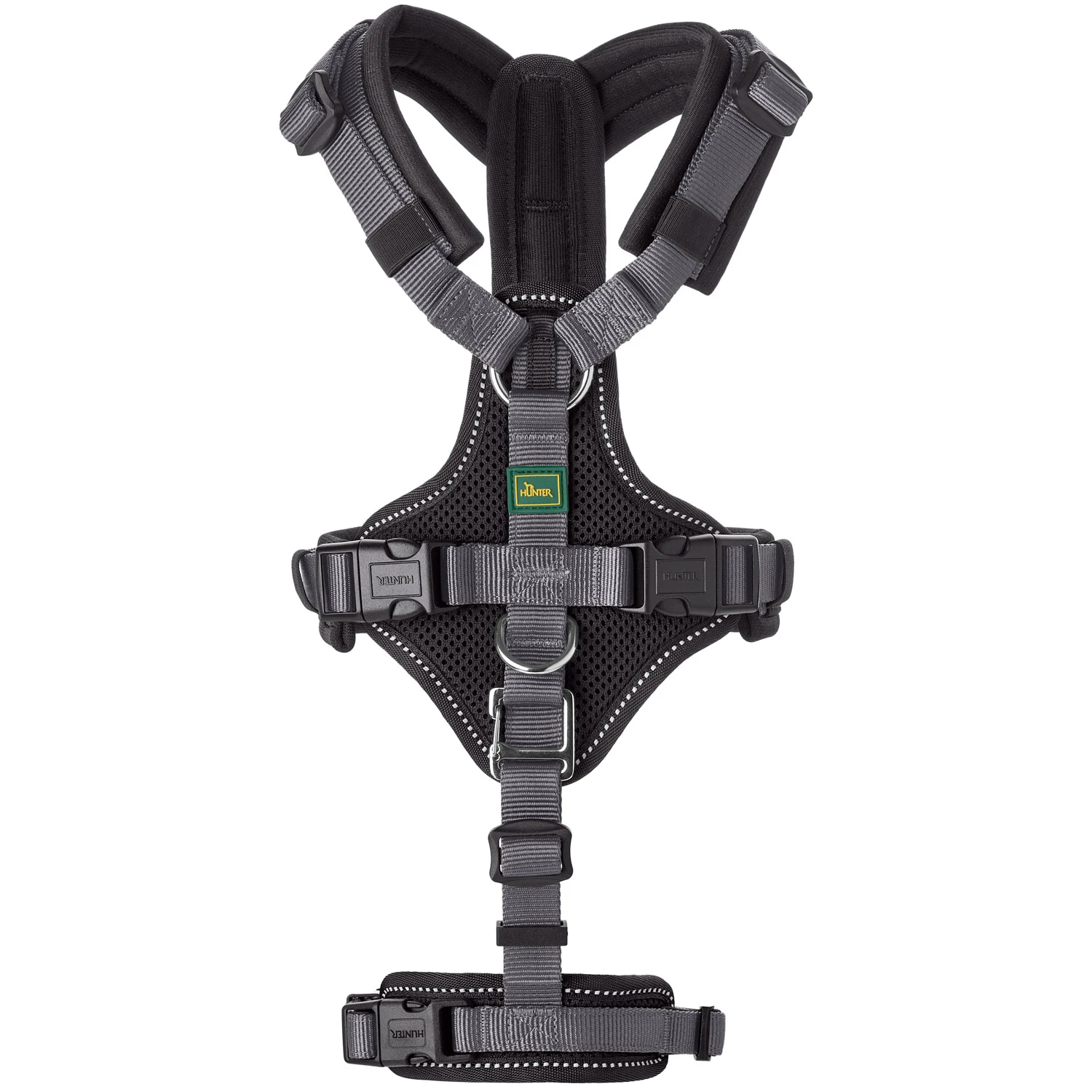 Het Hunter Veiligheidsharnas Maldon is ideaal voor uw schichtige viervoeter. Ondersteun uw hond in gevaarlijke situaties met behulp van het handvat op de rug. Het tuigje beschikt over meerdere verstelbare riemen, met in het bijzonder de extra buik- of heupgordel. Deze band zorgt ervoor dat uw viervoeter niet zomaar langs de achterkant uit het harnas kan ontsnappen. Deze extra riem is gemakkelijk te verwijderen wanneer deze niet meer nodig is. De lichtgewicht klikgespen maken dat het harnas eenvoudig en snel om te doen is. Het tuigje is verkrijgbaar in verschillende maten en leuke kleuren.
